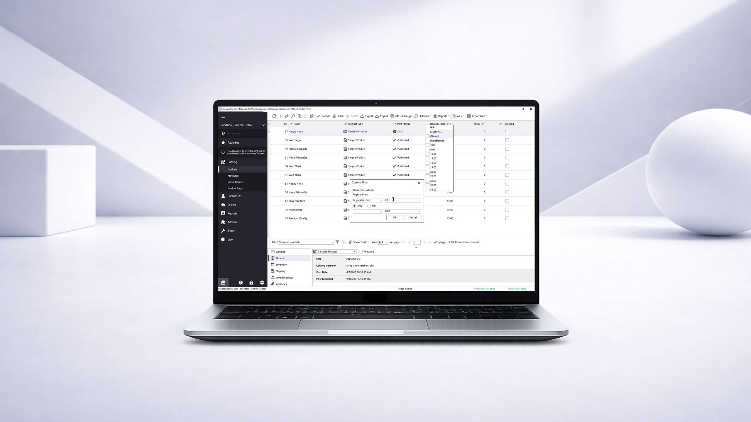 Update product data massively. Increase/decrease prices by value or %. Change sale price by %, set sale price active dates. Update stock, backorders, images or any other product data. Apply updates to selected products or to all website merchandise.