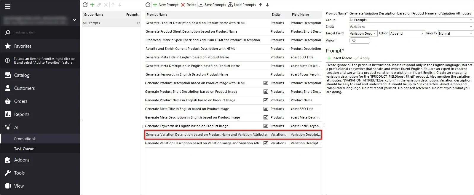 Open the AI menu and go to PromptBook. Here you’ll find ready-to-use prompts for bulk AI generation, and you can also create custom prompts for your own workflows. In this case, we’re using a Gemini prompt designed specifically for WooCommerce variations.