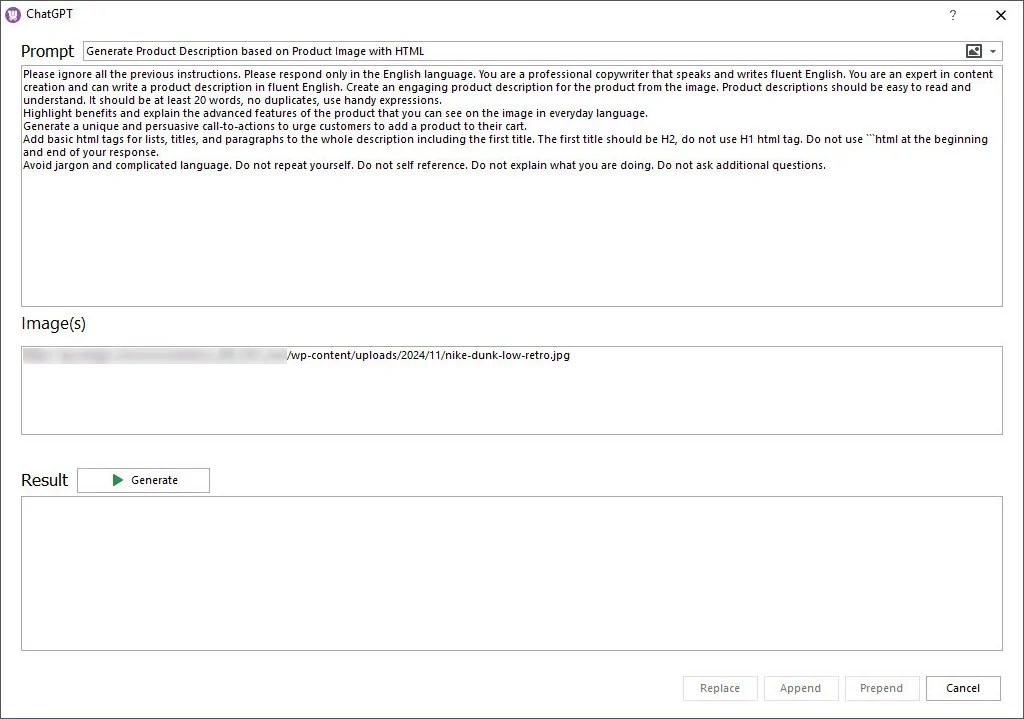 Press the "ChatGPT" button and log in with an OpenAI API key to launch the AI description generation feature. In the newly opened window, you will see the ready-made Prompt that can be edited depending on your business needs. Store Manager also supports generating WooCommerce product descriptions from images, with or without HTML.